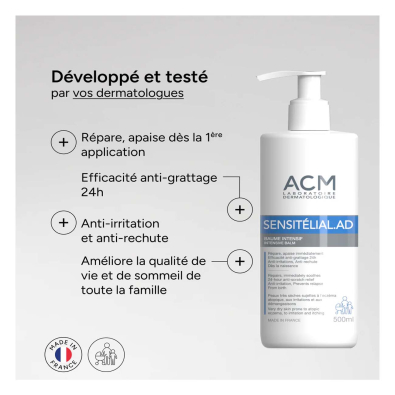 O ACM Sensitélial AD Bálsamo Intensivo 500 ml proporciona hidratação intensa e alívio imediato para pele muito seca e sensível, incluindo peles com tendência atópica, irritação ou prurido.