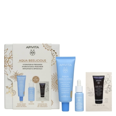 Apivita Aqua Beelicious Coffret Hydration & Freshness Creme com Cor é um conjunto composto por: 1 Apivita Aqua Beelicious Fluido Hidratante Com Cor SPF30 (40ml) e, de oferta, 1 Apivita Aqua Beelicious Booster Hidratante (10ml) e 1 Apivita Black Detox Cleasing Jelly Gel de Limpeza (5ml).
