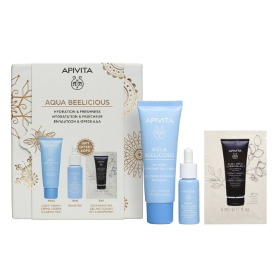 Apivita Aqua Beelicious Coffret Hidratação e Frescura é um conjunto composto por: 1 Apivita Aqua Beelicious Creme Ligeiro (40ml), 1 Apivita Aqua Beelicious Booster Sérum (10ml) e 1 Apivita Black Detox Gel de Limpeza (5ml).