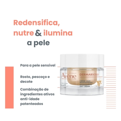 Com tripla ação e uma fórmula composta por 80% de ingredientes de origem natural, Avène DermAbsolu Creme de Dia atua na flacidez, perda de densidade e falta de conforto.