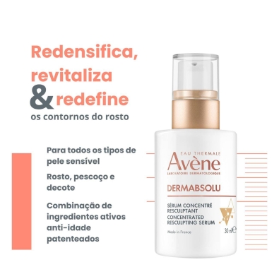 Com tripla ação e uma fórmula composta por 88% de ingredientes de origem natural, Avène DermAbsolu Sérum atua na flacidez e na perda de densidade.