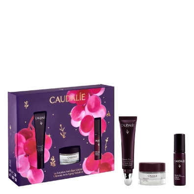 Caudalie Coffret Solução Antienvelhecimento Global é um conjunto composto por: 1 Caudalie Premier Cru Creme de Olhos (15ml) e, de oferta, 1 Caudalie Premier Cru Sérum Antienvelhecimento Global (10ml) e 1 Caudalie Premier Cru Creme Antienvelhecimento Global (15ml).