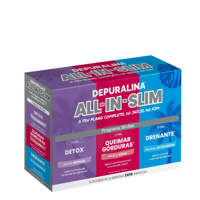 Depuralina All in Slim Ampolas é um suplemento alimentar que promove um programa integral de emagrecimento por meio de extratos concentrados de plantas.