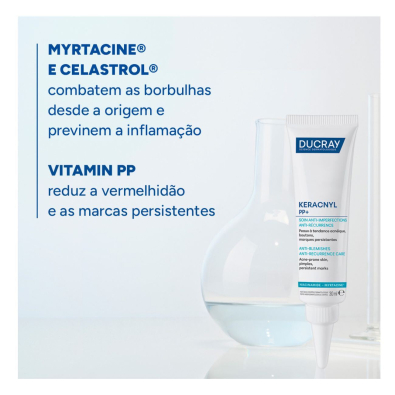 Com Mirtacina® na sua composição, Ducray Keracnyl PP+ Creme Anti-Imperfeições favorece a diminuição de imperfeições e marcas, ao mesmo tempo que previne o seu reaparecimento.
