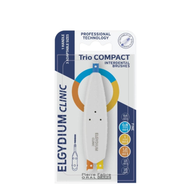 Com um sistema compacto e prático, Elgydium Clinic Escovilhões Trio Compact inclui três escovilhões de medidas diferentes para uma limpeza irrepreensível: 1 de 0.8mm (azul), 1 de 1.0mm (amarelo) e 1 de 1.2mm (laranja).
