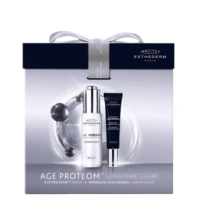 Esthederm Coffret Age-Proteom Longevidade Celular é um conjunto composto por 1 Esthederm Age Proteom Sérum (30ml) e 1 Esthederm Intensive Hyaluronic+ Sérum de Olhos (15ml).