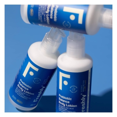 Freshly Prebiotic Balance Lotion equilibra o microbioma da pele e fortalece a barreira cutânea, promovendo uma pele saudável e hidratada.