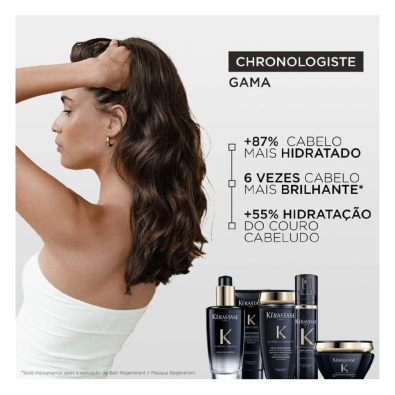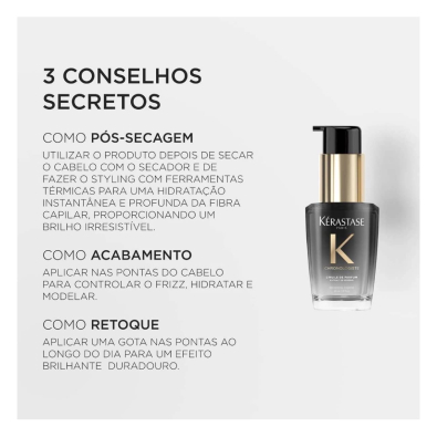 Com fotoproteção, o Óleo Capilar Revitalizante Kérastase Chronologiste L'Huile de Parfum protege os fios, deixando-os fortalecidos, com menos pontas espigadas e menos propensos à quebra.