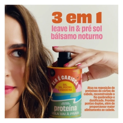 A Lola Ela é Carioca Proteína Capilar Lola Vai à Praia foi desenvolvida para restaurar e proteger o cabelo após a exposição ao sol, sal e cloro, devolvendo-lhe hidratação e brilho.