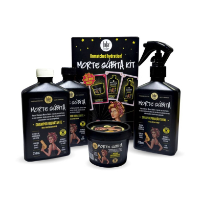 Lola Kit Morte Súbita é composto por: 1 Lola Morte Súbita Shampoo Hidratante (250ml), 1 Lola Morte Súbita Condicionador Hidratante (250ml), 1 Lola Morte Súbita Máscara Super Hidratante (100g) e 1 Lola Morte Súbita Spray Reparação Total (250ml).