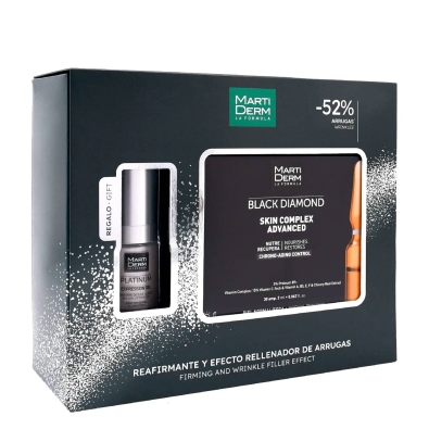 O Coffret Martiderm Platinum e Black Diamond é composto por: 1 Martiderm Black Diamond Ampolas Skin Complex Advanced (30x2ml) e 1 Martiderm Platinum Expression Gel Contorno (15ml).