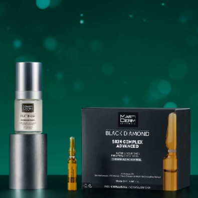 Ideal para pele normal a seca, com sinais de envelhecimento, o Martiderm Platinum e Black Diamond Coffret que proporciona hidratação, nutrição e firmeza ao rosto, lábios e olhos, atenuando rugas e linhas de expressão.