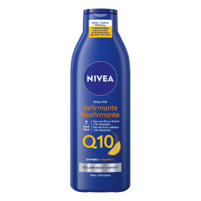 O Nivea Body Milk Q10 Refirmante foi desenvolvido para proporcionar hidratação prolongada e melhorar a firmeza e elasticidade da pele seca.