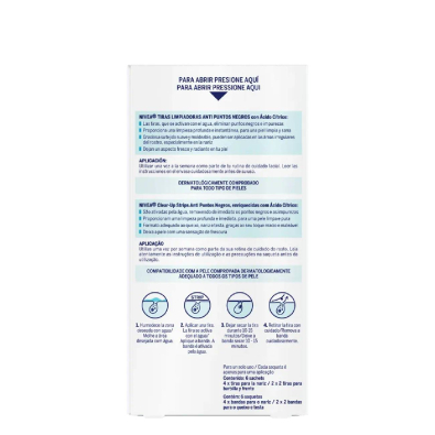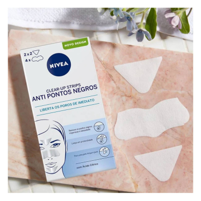 Enriquecidas com ácido cítrico e ativadas pela água, Nivea Clear-Up Strips removem de imediato os pontos negros, as impurezas e oleosidade, ao mesmo tempo que proporcionam uma limpeza profunda.