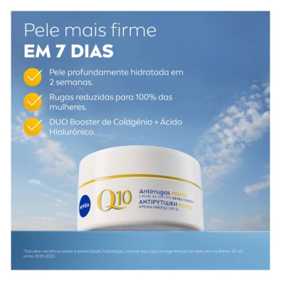O Nivea Q10 Power Creme Dia Antirrugas SPF15 combate as rugas e melhora a firmeza da pele, proporcionando uma aparência mais jovem e saudável.
