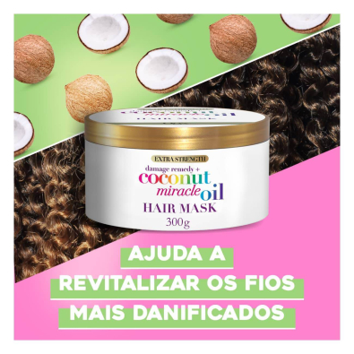 OGX Damage Remedy Coconut Miracle Oil Máscara Reparadora nutre e repara profundamente o cabelo danificado, devolvendo-lhe a vitalidade e o brilho.