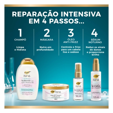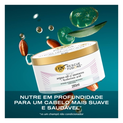 OGX Rescue Fusions Máscara Hidratação Intensa proporciona uma hidratação intensa e profunda, revitalizando a fibra capilar.