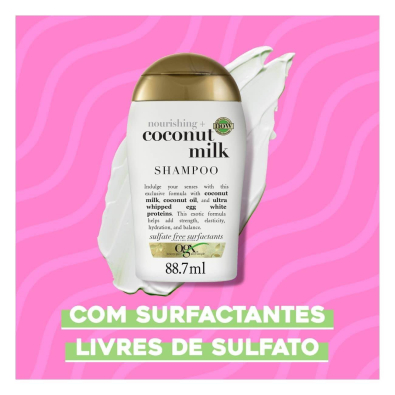 OGX Nourishing Coconut Milk Shampoo nutre e hidrata o cabelo, deixando-o suave e brilhante.