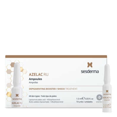 Sesderma Azelac RU Ampolas Despigmentantes 10un. atuam diretamente nas manchas, uniformizando o tom de pele e prevenindo o seu aparecimento.