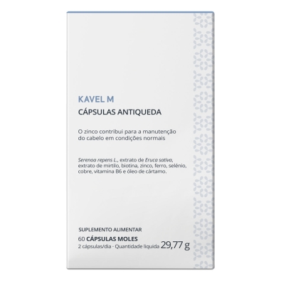 Com ingredientes como serenoa repens, Eruca sativa, ferro, zinco e biotina, Kavel-M ajuda a nutrir o cabelo desde a raiz, protegendo-o da queda e favorecendo uma aparência mais forte e saudável. Ideal para quem procura complementar a alimentação com nutrientes específicos para a saúde capilar.