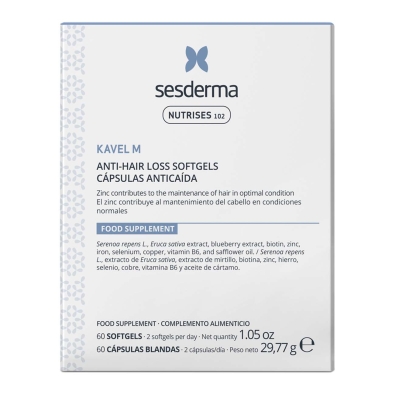 O Sesderma Kavel-M Cápsulas é um suplemento alimentar formulado com vitaminas, minerais e extratos vegetais que cuidam do cabelo, reforçando a sua resistência e promovendo crescimento saudável.