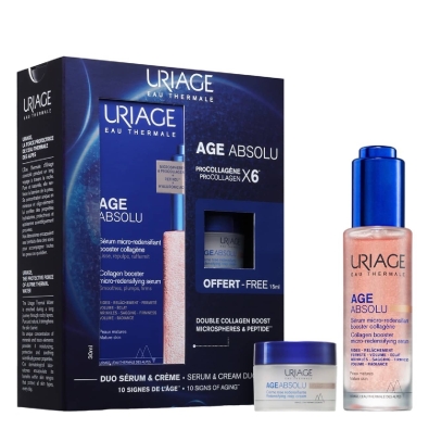 Uriage Coffret Age Absolu Antienvelhecimento é composto por: 1 Uriage Age Absolu Sérum Micro-Redensificador (30ml) e 1 Uriage Creme Rosa Redensificante (15ml).