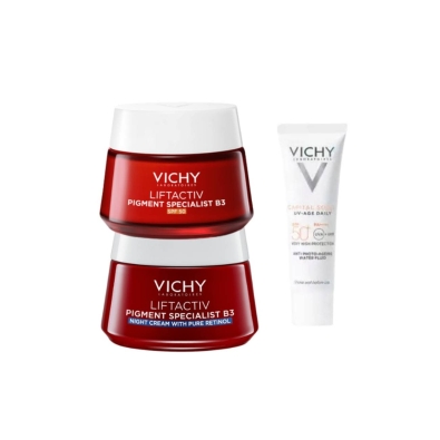O Coffret Vichy Liftactiv Pigment Specialist B3 é composto por: 1 Creme de Dia FPS50 Vichy Liftactiv Pigment Specialist B3(50ml), 1 Creme de Noite Antimanchas Vichy Liftactiv Pigment Specialist B3 (50ml) e 1 Fluido UV-Age FPS50+ Vichy Capital Soleil (15ml).