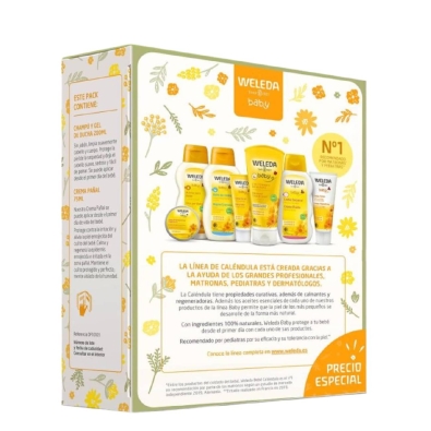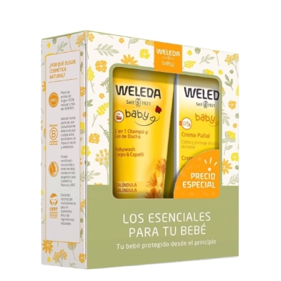 Weleda Pack Top Essenciais do Bebé é um conjunto composto por: 1 Weleda Shampoo e Gel de Banho de Calêndula (200ml) e 1 Weleda Creme Muda Fraldas de Calêndula (75ml).